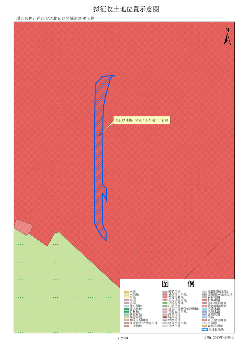 由政府組織實(shí)施的能源、交通、水利、通信、郵政等基礎(chǔ)設(shè)施建設(shè)需要用地,項(xiàng)目名稱為通江大道北延地面輔道新建工程。
