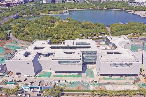 從空中俯瞰無錫美術(shù)館,其形似太湖石的建筑造型已躍然于尚賢湖畔。內(nèi)部設計也透露出濃厚的藝術(shù)氣息。