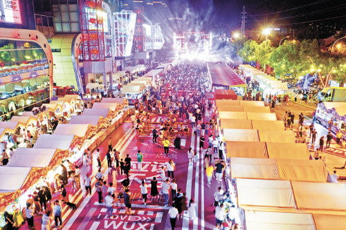 為有效把“蘇超”帶來(lái)的流量轉(zhuǎn)化為持久的經(jīng)濟(jì)動(dòng)能,無(wú)錫配合賽事,利用多個(gè)商場(chǎng)、景區(qū)、戶外廣場(chǎng)大屏進(jìn)行直播,打造遍布全城的“第二現(xiàn)場(chǎng)”,與城市空間、消費(fèi)場(chǎng)景深度融合。大東方百貨不僅設(shè)置了兩處大屏直播點(diǎn),更推出“跟著蘇超游無(wú)錫”主題活動(dòng);無(wú)錫招商城打造“夏日星空夜市”,有“蘇超”的周末客流量達(dá)上萬(wàn)人次;宜興“網(wǎng)紅夜市”蛟橋河步行街里,足球激情與地?cái)偨?jīng)濟(jì)碰撞出新火花……7—8月,中山路、長(zhǎng)江路、太湖新城等多個(gè)市商務(wù)局重點(diǎn)監(jiān)測(cè)商圈銷售額實(shí)現(xiàn)同比兩位數(shù)增長(zhǎng),其中中山路商圈單月增幅超20%。