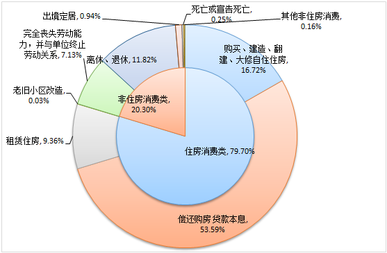 2025年三季度,住房消費(fèi)類(lèi)提取金額為53.51億元,環(huán)比下降2.16%,占當(dāng)季提取額的79.7%。其中還貸提取占比最高,提取金額35.98億元,占當(dāng)季提取額的53.59%。具體提取結(jié)構(gòu)如下: