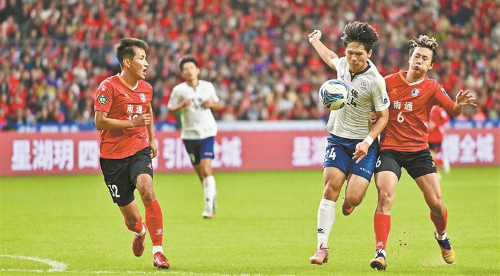 沉悶的局面到了第78分鐘有了波瀾。無錫隊反擊,下半場換上場的30號薛天用速度擺脫對方防守球員,但最后一腳射門偏出。此后,南通隊的反擊射門也被無錫隊擋出。嚴(yán)密防守下,雙方很難改變節(jié)奏,也難以打開局面。