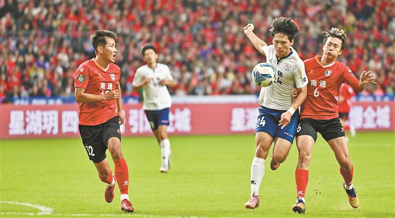 “蘇超”開賽以來,南通隊未嘗敗績。常規(guī)賽與無錫隊交手時,南通隊采用“高位逼搶+快速突擊”戰(zhàn)術(shù),占據(jù)了場上優(yōu)勢。八強(qiáng)賽中,南通隊又出人意料地變陣,將高大的中后衛(wèi)黃蔣大亞推到前場充當(dāng)中鋒,收到奇效。本場比賽,南通隊沿用這套成功打法對戰(zhàn)無錫隊。