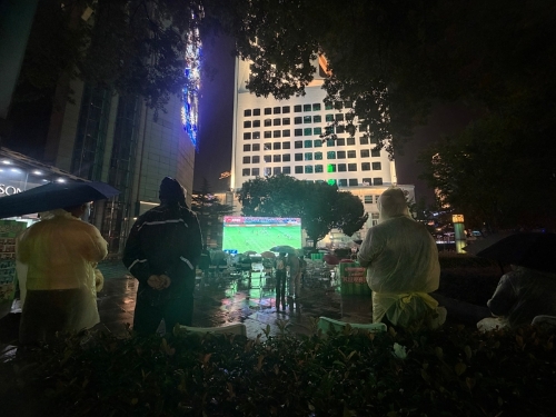 在1969創(chuàng)意工場(chǎng)南方夜市,空氣里彌漫著油炸的焦香和沸騰的人聲,夜市中央的巨型大屏前座無虛席。賣舟山鐵板魷魚的潘先生忙得頭也不抬:“球迷們一邊吃一邊看,時(shí)不時(shí)還要點(diǎn)單,今天的生意比平時(shí)好了不少。”對(duì)面手打檸檬茶的攤位上同樣火爆,光檸檬就消耗了50斤,補(bǔ)了三四次茶葉,平時(shí)一晚上賣出三四桶,當(dāng)天賽事剛開始,第六桶便已見底。南方夜市商家們?cè)诒WC食品安全的基礎(chǔ)上全力增加了備貨量,保障球迷吃喝一應(yīng)俱全。球迷顏亞鵬和3位朋友圍坐一起,桌上擺滿啤酒和烤串、炸薯?xiàng)l等各色小吃。“我們傍晚6點(diǎn)多就來占位子了,這種比賽,就得在夜市看,最有氛圍。”