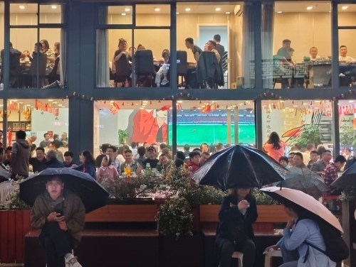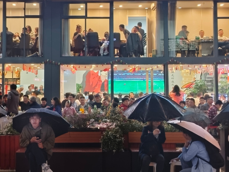 顯云街因“蘇超”半決賽而沸騰。夜幕降臨,一塊塊各具特色的招牌漸次亮起;亭臺(tái)中央,檐角下的直播大屏實(shí)時(shí)傳遞著“蘇超”賽場(chǎng)上的激情。盡管細(xì)雨不停,但大屏對(duì)面的外擺區(qū)域仍然坐滿了顧客。比賽進(jìn)入膠著時(shí)刻,整條街便化作了露天劇場(chǎng),球迷的心臟隨著攻防轉(zhuǎn)換共同跳動(dòng),不少躲雨的行人也加入助威行列。“店內(nèi)店外都坐滿了人,相較于以往的雨夜,客流增長(zhǎng)了超50%。”大屏正對(duì)面的天府龍蝦烤全羊店內(nèi)同樣播放起了“蘇超”賽事,老板娘薛尤介紹,兩塊直播大屏對(duì)門店客流帶動(dòng)效果明顯,有無錫隊(duì)比賽的夜晚場(chǎng)場(chǎng)爆滿。