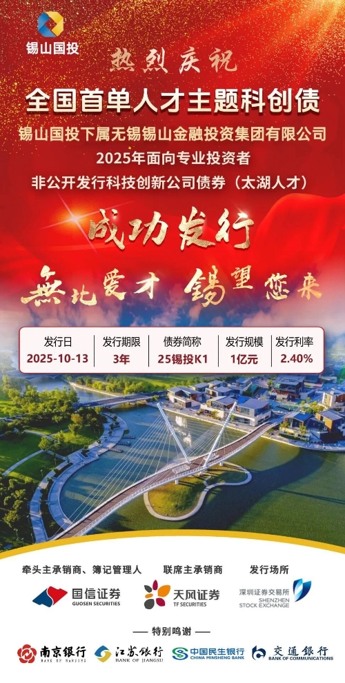 近日,無錫錫山金融投資集團(tuán)有限公司2025年面向?qū)I(yè)投資者非公開發(fā)行科技創(chuàng)新公司債券(太湖人才)成功落地。記者獲悉,該債券由國信證券任牽頭主承銷商及簿記管理人,天風(fēng)證券任聯(lián)席主承銷商,發(fā)行規(guī)模1億元,期限3年,發(fā)行利率2.4%,系全國首單以人才為主題的科技創(chuàng)新債券。