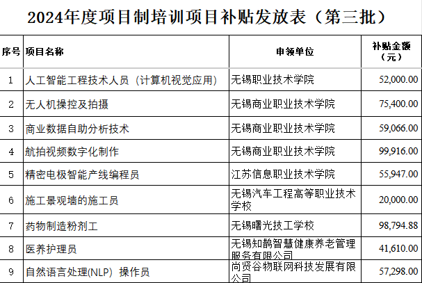 根據(jù)《市人力資源和社會保障局市財政局關(guān)于加強和改進政府補貼性職業(yè)技能培訓(xùn)管理工作的通知》(錫人社發(fā)〔2023〕41號)精神,截至目前,2024年度項目制培訓(xùn)已有9個項目完成結(jié)班,并通過第三方無錫華夏中誠會計師事務(wù)所(普通合伙)的審核?,F(xiàn)根據(jù)第三方提交的項目《決算審核報告》進行補貼發(fā)放,發(fā)放情況如下: