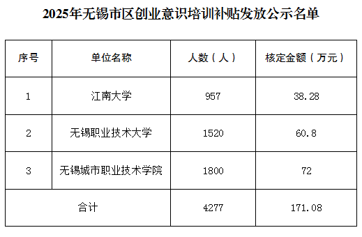 根據(jù)《關(guān)于鼓勵在錫大中專院校開展大學(xué)生創(chuàng)業(yè)意識培訓(xùn)的通知》(錫人社發(fā)〔2020〕73號)《關(guān)于發(fā)布2025年無錫市政府補(bǔ)貼性職業(yè)技能培訓(xùn)項目等指導(dǎo)目錄的通知》(錫人社函〔2025〕35號)文件精神,現(xiàn)將2025年創(chuàng)業(yè)意識培訓(xùn)補(bǔ)貼審核情況公示如下,公示期自即日起7天,如有異議,請及時以書面或口頭形式向無錫市勞動就業(yè)管理中心反映,聯(lián)系電話:0510-82829088。